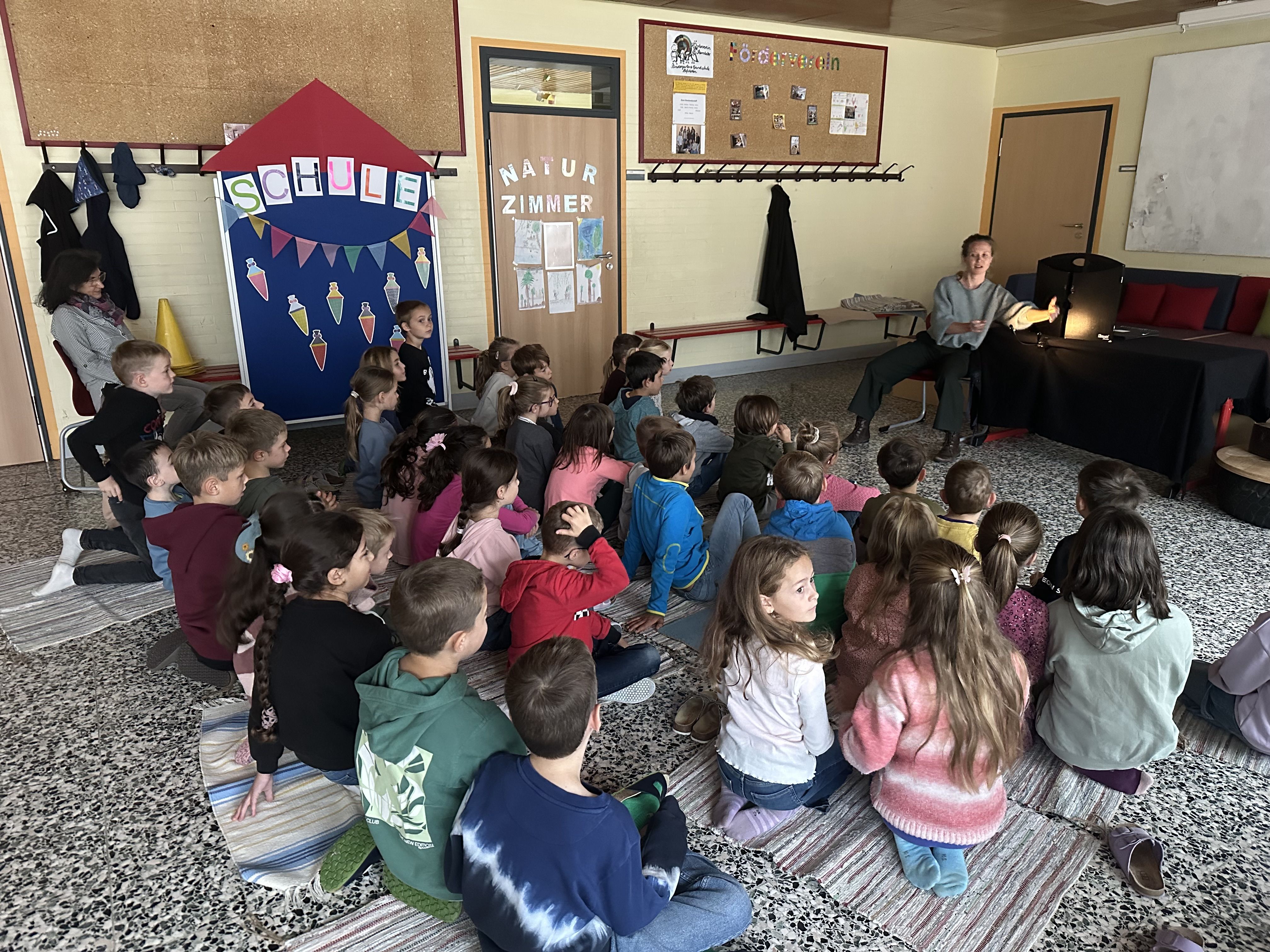 Anlässlich des Fredericktags besuchte uns eine Geschichtenerzählerin. Die Schülerinnen und Schüler folgten den Erzählungen sehr gespannt und fragten sich, ob die Geschichten wirklich passiert sind?